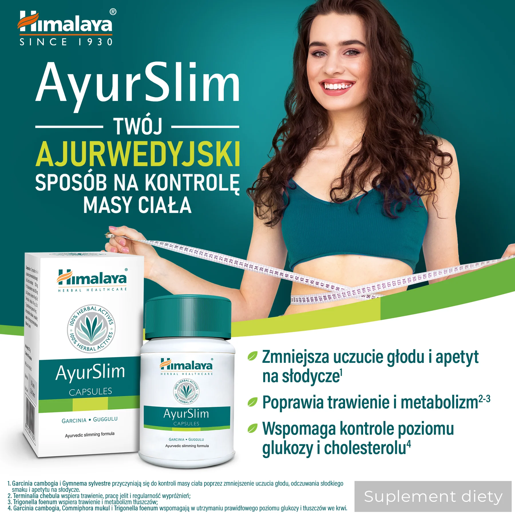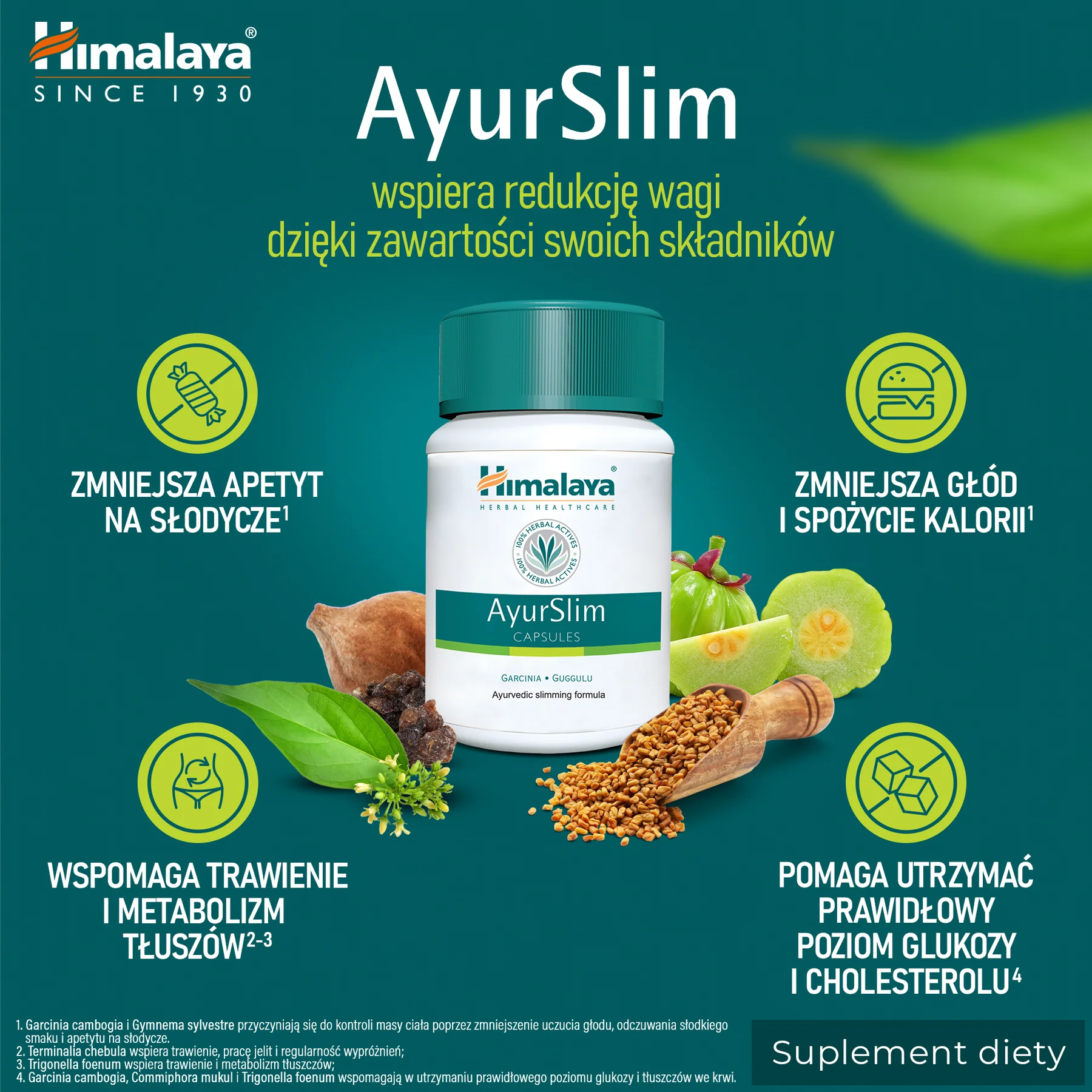 Ekstrakt Garcinia cambogia pomaga w kontroli wagi, zmniejsza poczucie apetytu i przyczynia się do zmniejszenia zapasów tłuszczu. Powderof Balsamodendron mukul pomaga utrzymać prawidłowy poziom cholesterolu i lipidów w surowicy. Extrract Gymnema sylvestre zmniejsza łaknienie słodyczy. Extrract Terminalia chebula pomaga w utrzymaniu funkcji trawiennych i zrównoważeniu poziomu gazów trawiennych. Extrtract Trigonella foenum graeceum pomaga utrzymać równowagę cukrów fizjologicznych.